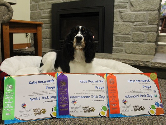 Home Males Females Puppies Our Past Breed Info Agility Fun Photos All Stars Junior Handling Links Contact Us Site Map Karmadi's Valkyrie ATD"Freya"Whelped: January 9, 2019 OFA Hips GoodOFA Elbows Normal PRA Carrier PFK Clear Fuco Clear We wish Kathleen and Freya much success on their new ventures! Shown below with her new trick dog titles!!